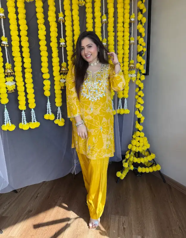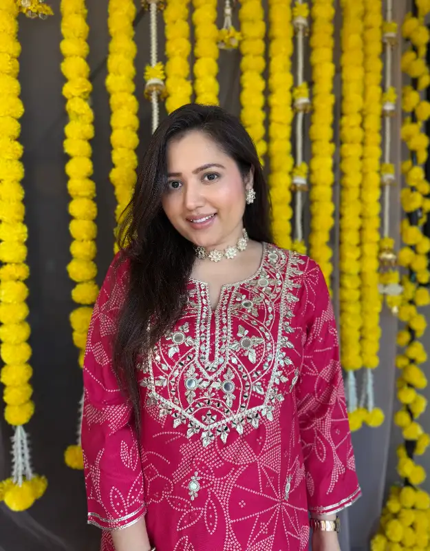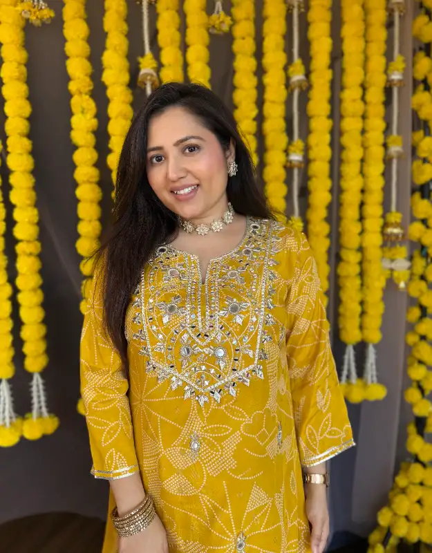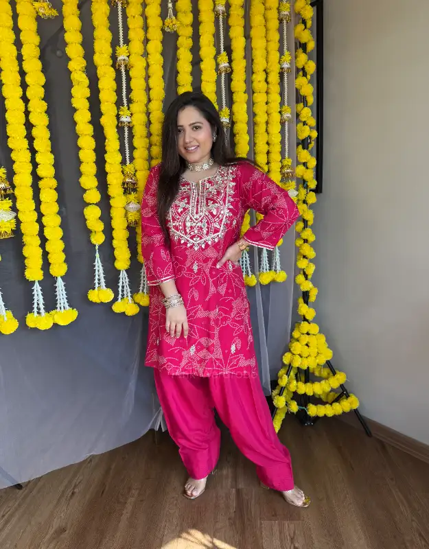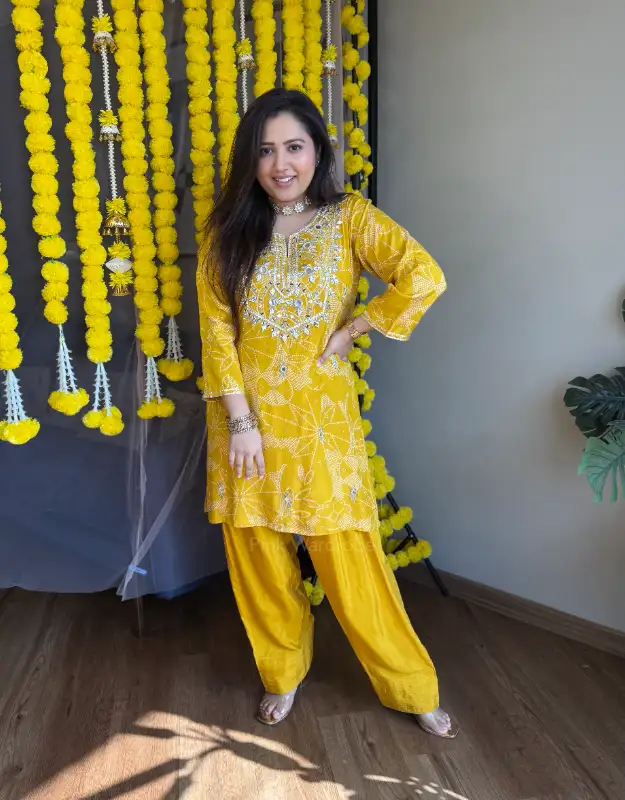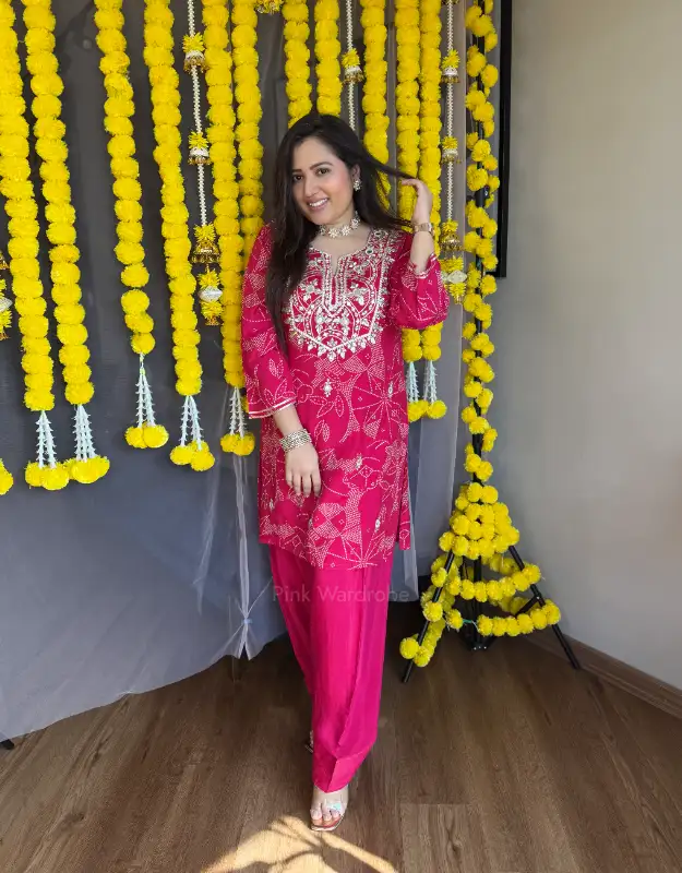A beautiful Farshi Salwar set available in two premium festive colors — pink and yellow. The top is crafted in premium muslin fabric and adorned with Bandhej print, featuring intricate mirror and gota work detailing all over, adding that perfect festive sparkle. Paired with a flowy Farshi salwar, both sets exude timeless elegance and are perfect for Diwali, Haldi, Mehendi, Sangeet, Roka, wedding functions, or Karwa Chauth celebrations.