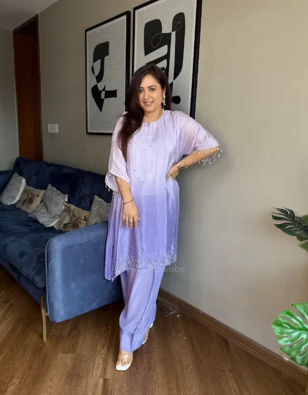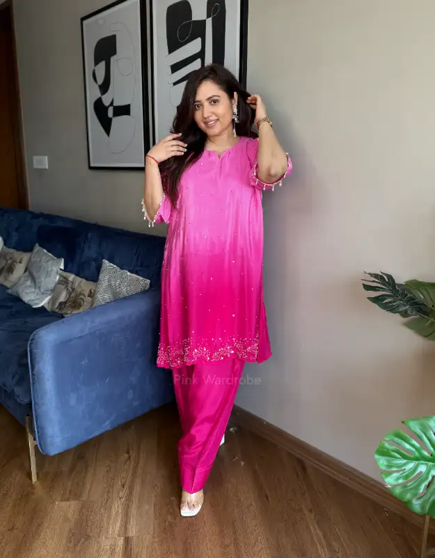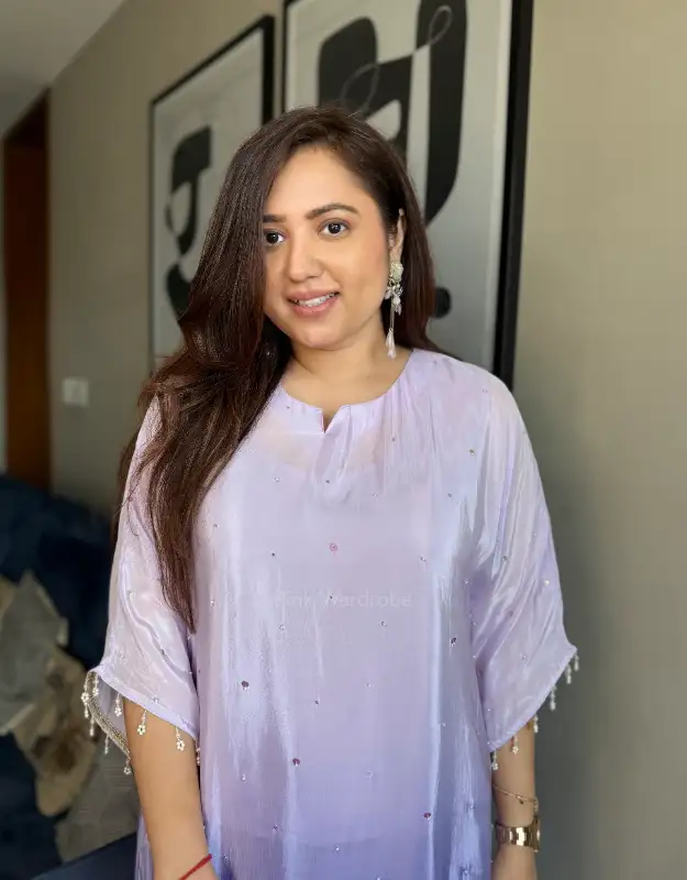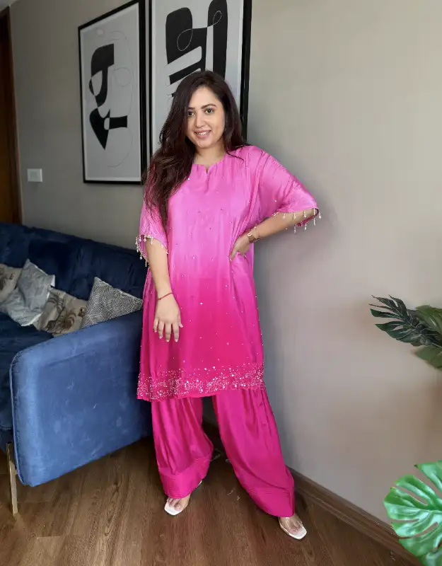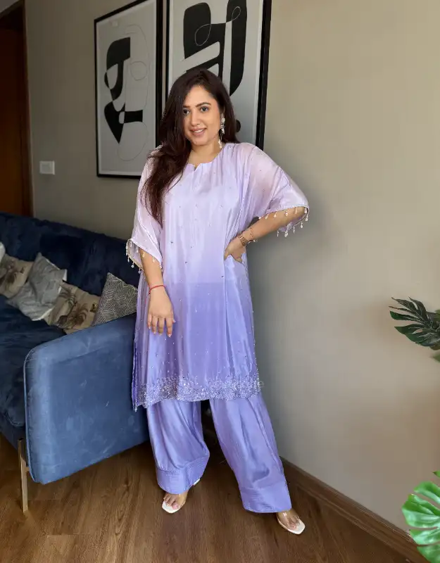 A stunning ombre coordinated set in natural crepe silk, designed for effortless luxury. Featuring a loose-fit ombre kurta in soft lilac and pink hues, beautifully enhanced with delicate pearl handwork all over, and paired with a trendy farshi salwar. Fluid, elegant, and contemporary—this ensemble is perfect for festive soirées, wedding functions, intimate celebrations, and luxury day events. A refined blend of modern Indian wear, understated opulence, and premium craftsmanship.