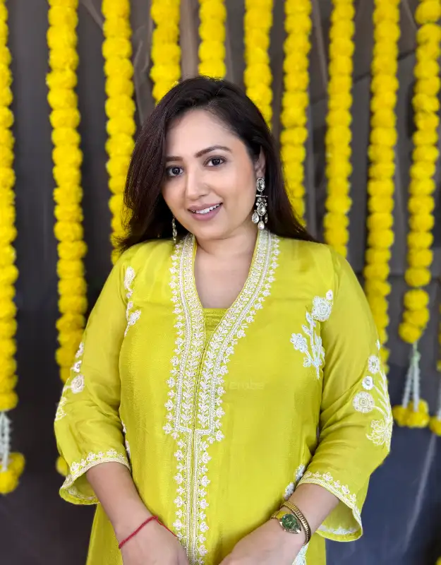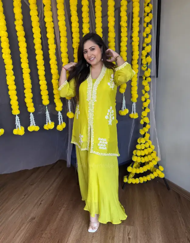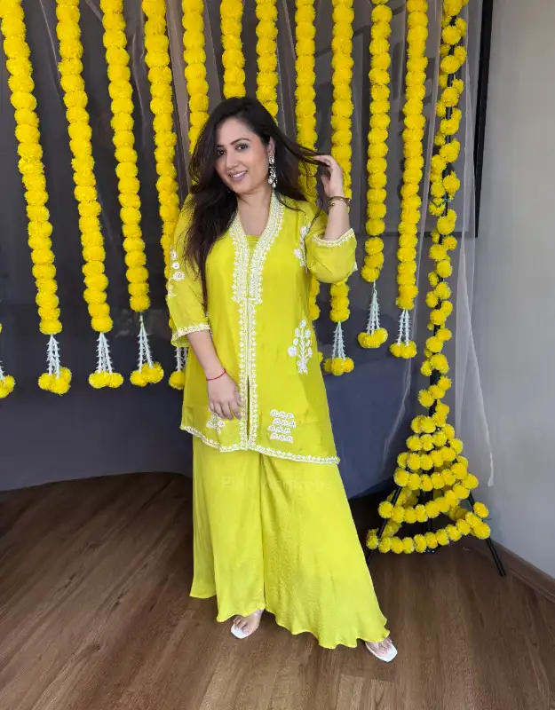 A chic and stylish short kurta in premium chinon, featuring intricate embroidery with pearl and threadwork detailing all over. Paired with premium chinon flowy plazo in an uneven smart cut hemline, this set brings movement and elegance together. Perfect for sangeet dance nights, cocktail parties, Diwali card parties, or festive functions, this ensemble makes a true statement look.