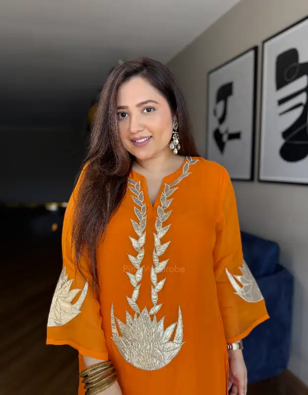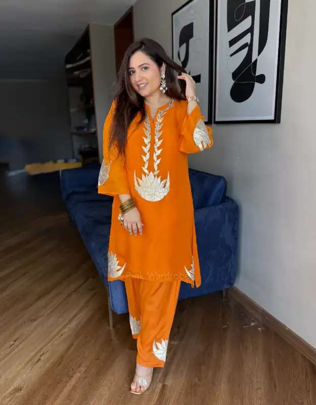 A beautiful and elegant coordinated set in a trendy orange shade, crafted in pure organza fabric. The kurta features intricate applique work with tissue floral motifs, adding a rich handcrafted touch. It’s paired with a smart farshi salwar that also carries beautiful detailing, giving the entire set a graceful and festive appeal. Perfect for your Haldi, Mehendi, pre-wedding events, or festive parties, this outfit brings together tradition and trend in the most effortless way. The silhouette flatters all body types and age groups, making it a must-have for your wedding trousseau or festive wardrobe.