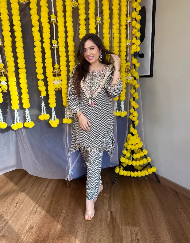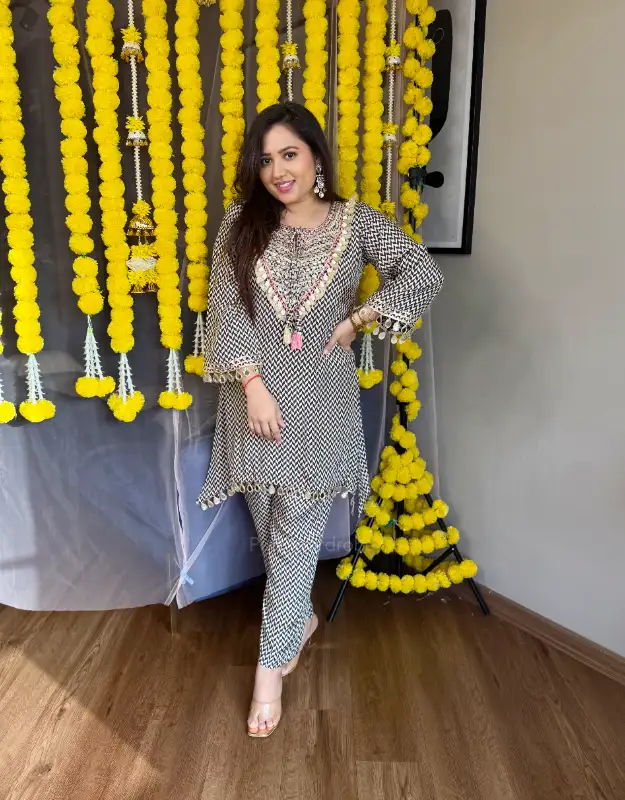 A beautiful monochrome chevron print coordinated set that defines modern elegance with a hint of festive sparkle. The tail-cut kurta features mirror lace detailing on the hemline and sleeves, while the neckline is heavily embellished with real mirror work, enhanced with podi and lace detailing—giving it a sophisticated yet chic appeal. The geometric chevron print adds a vibrant and contemporary vibe, making it a perfect outfit for the wedding season, from cocktail nights to sangeet celebrations, or even your kitty parties. This ensemble perfectly blends modern charm with traditional craftsmanship, ensuring you stand out effortlessly.