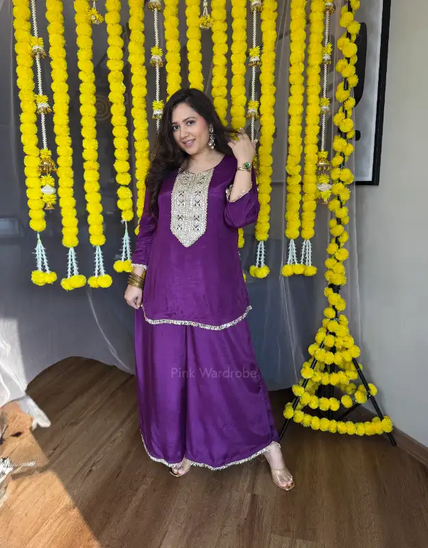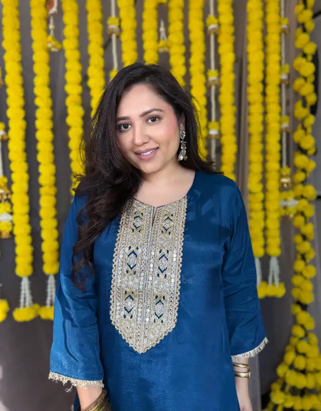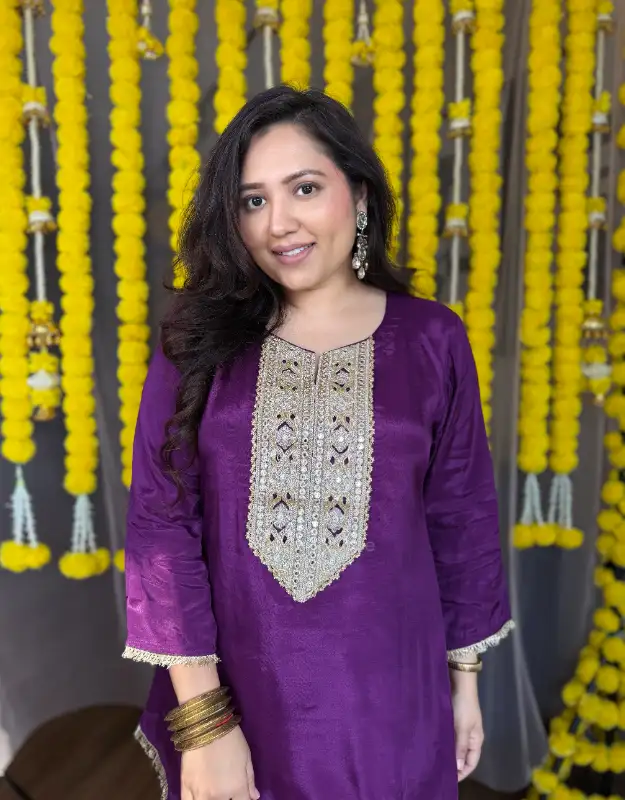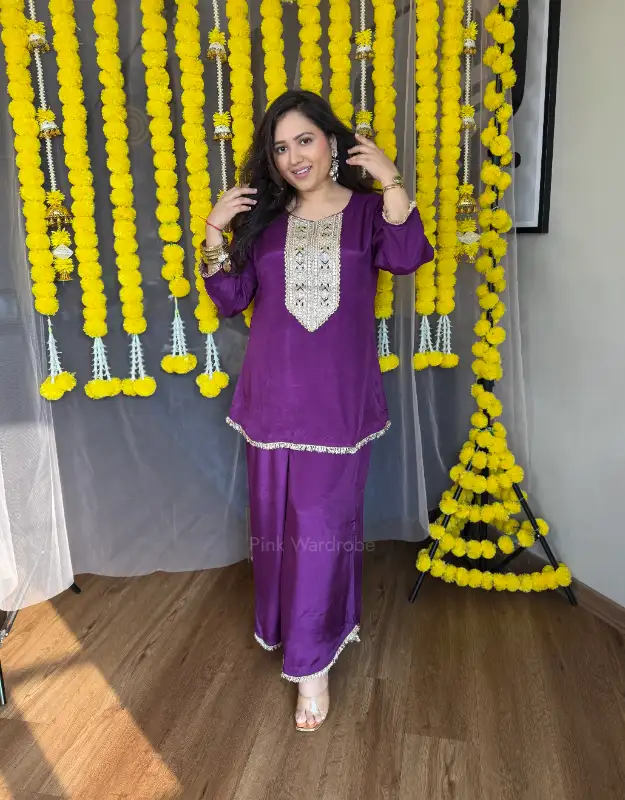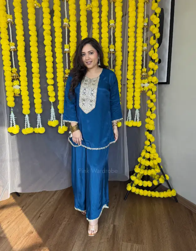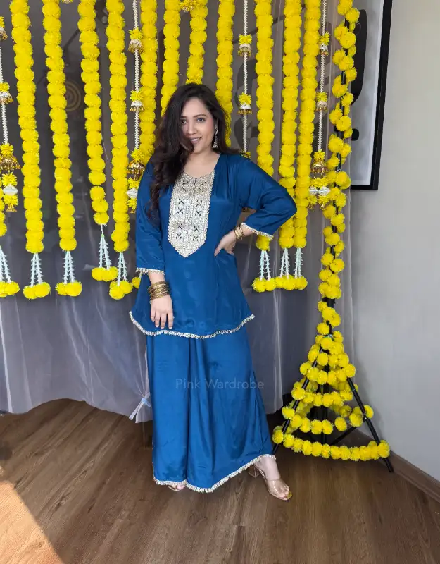 Two exquisite silk coordinated sets in rich solid colors — crafted to perfection for the festive season. Each set features an intricately detailed neckline adorned with delicate kiran lace work on the sleeves and the hemline of the short kurta, extending gracefully to the bottoms. The flowy, smart slant-cut plazo pants add a refined edge, making the ensemble effortlessly chic and comfortable.