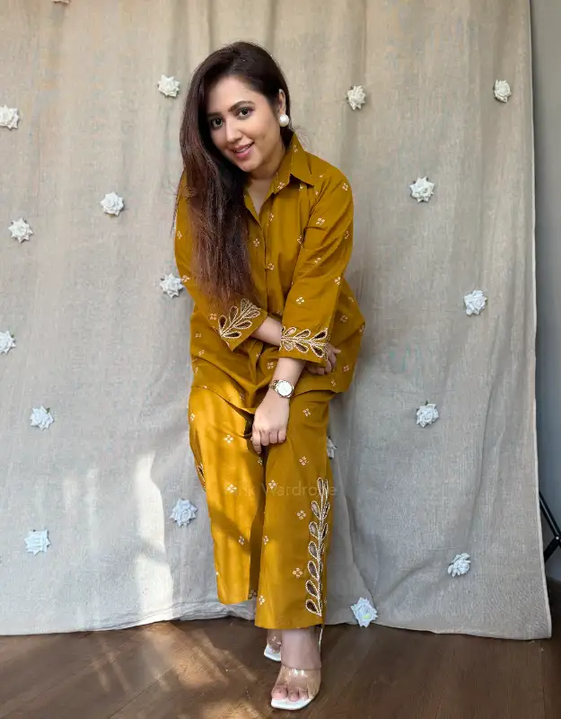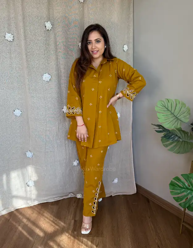 Elevate your everyday style with this beautiful co-ord set crafted in premium Jamzani woven cotton. The A-line top features intricate cutwork detailing on the sleeves, while the trousers carry the same artistry along the sides—adding just the right amount of elegance. Lightweight, breathable, and effortlessly stylish, this woven cotton coordinated set is perfect for daily wear, office looks, casual outings, or even a romantic date night. The rich texture and smart fit flatter all Indian body types and skin tones, making it a wardrobe must-have