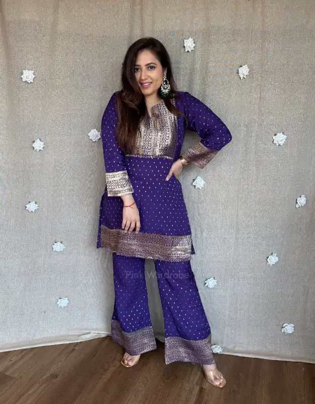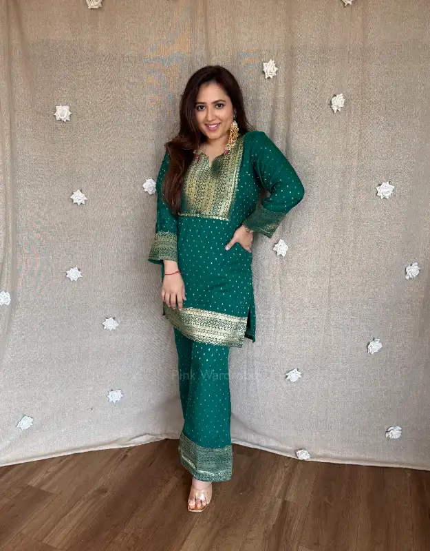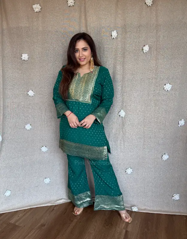 Step into effortless elegance with our luxury Kosai silk jacquard co-ord set, beautifully adorned with intricate zari booties all over the top and enhanced with rich jacquard silk neckline detailing. The fine zari craftsmanship adds a subtle festive shimmer, making it a perfect choice for summer weddings, godhbharai, puja, sangeet, and intimate celebrations.