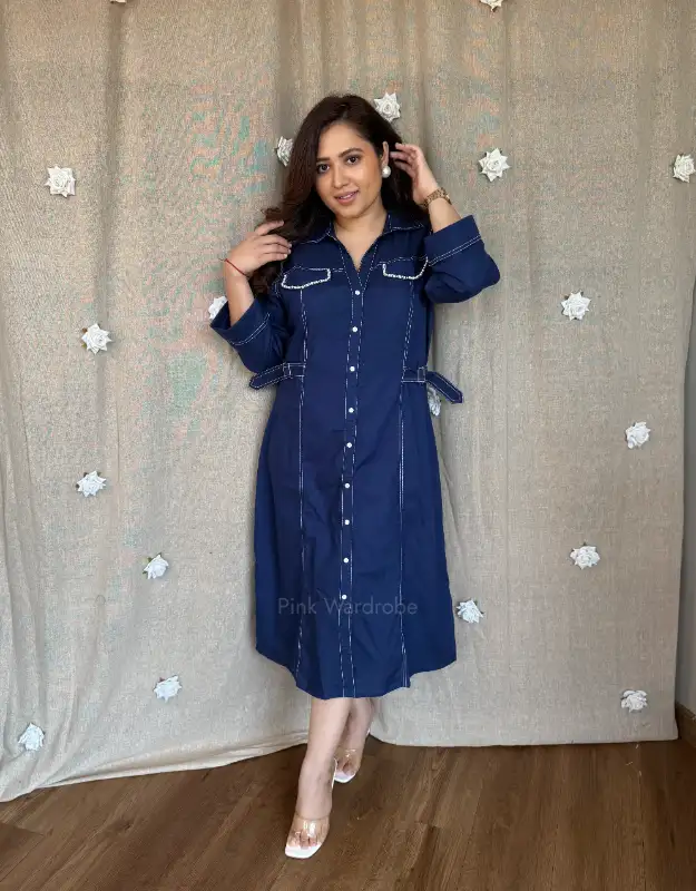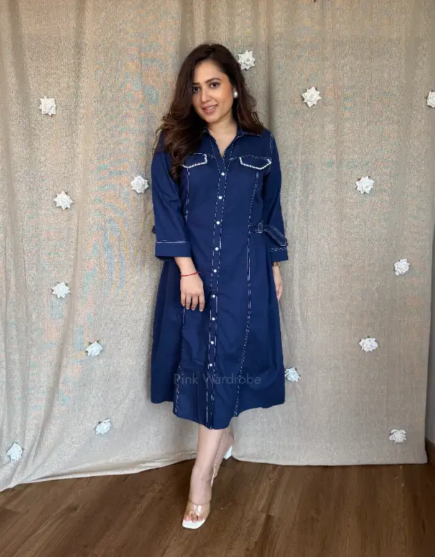 Crafted in premium breathable cotton that visually resembles classic denim, this elegant A-line dress is lightweight, soft, and ideal for Indian summers, vacation outfits, brunch styling, and everyday smart casual dressing.
