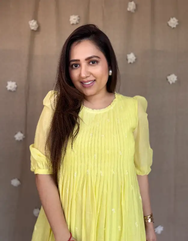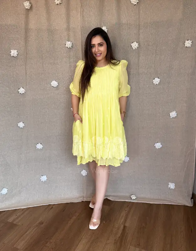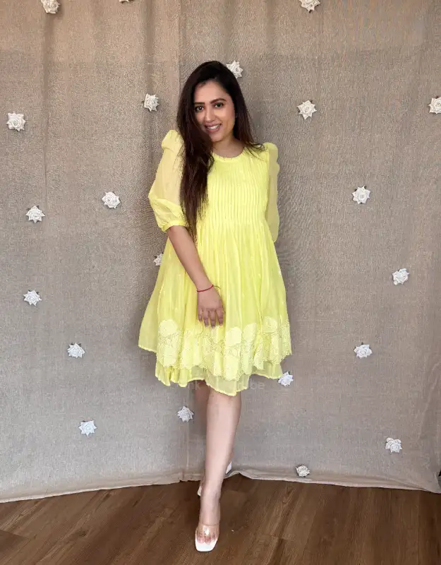 Soft, graceful, and effortlessly elegant — this butter yellow mulled cotton dress is crafted for women who love subtle luxury. Designed in a flattering A-line silhouette, it features delicate pintuck pleated detailing on the neckline, finished with dainty pearl (pole) accents, and soft puffy sleeves that add a romantic charm. The double-layered cotton construction ensures comfort and finesse, while the intricate floral embroidery along the hemline elevates its timeless appeal. Complete with functional side pockets, this dress is thoughtfully tailored to suit all Indian body types and complement all skin tones.