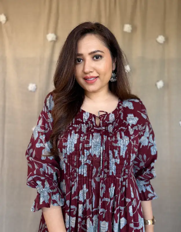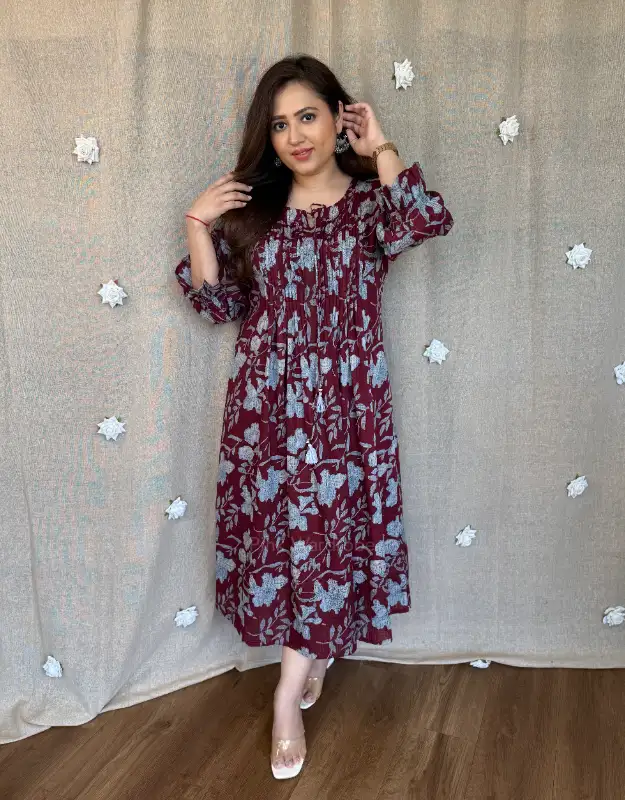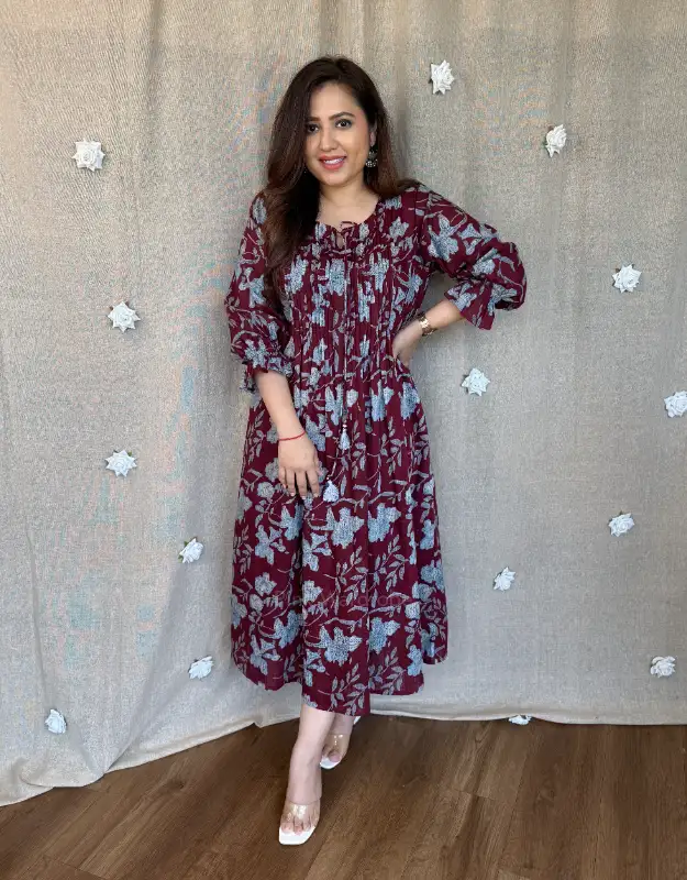 Gracefully feminine and effortlessly stylish, our Maroon Bloom Pintuck Dress is crafted in premium breathable cotton featuring statement floral motifs in elegant maroon tones. Designed with beautiful front pintuck detailing that adds structure and charm, this flowy A-line silhouette flatters every body type while offering unmatched comfort. The soft gathered sleeves and delicate tie-up neckline enhance its graceful appeal, making it a perfect pick for office wear, brunch outings, daily wear, or elevated casual dressing. Style it with heels or pair it with trousers for a chic layered ethnic look.