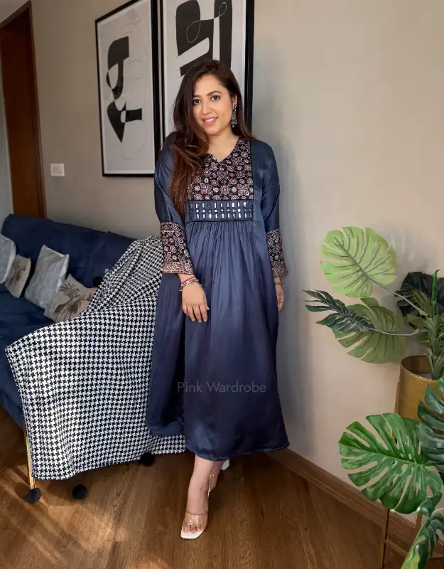 A statement Ajrak printed dress in premium modal satin, designed for effortless elegance. Featuring intricate real Gujarati mirror work on the neckline, this A-line silhouette with a functional side pocket blends comfort with refined style. The rich Ajrak motifs paired with a modern cut create a perfect fusion of traditional Indian craftsmanship and contemporary western silhouettes, making it ideal for small get-togethers, festive parties, and elegant day-to-evening wear. Chic, breathable, and luxuriously fluid—this dress is crafted for the modern Indian woman who loves heritage with a stylish edge.