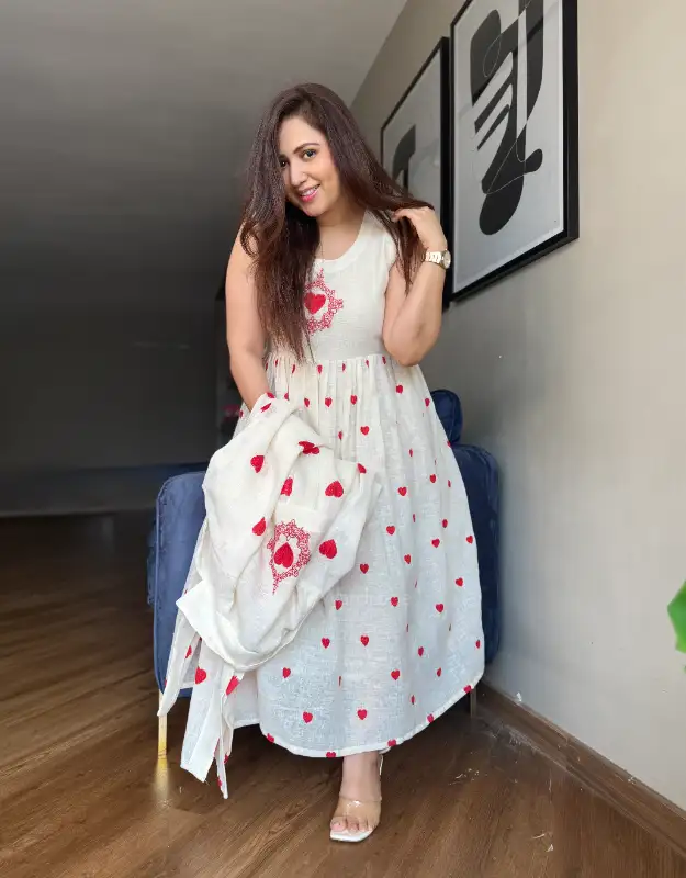 Meet our stunning cotton linen blend jacket dress set, designed for women who love elegance with a chic edge. Featuring a sleeveless pleated inner dress and a smart embroidered jacket, this outfit is detailed with delicate heart motif embroidery all over, while the jacket back showcases a statement embroidered design.