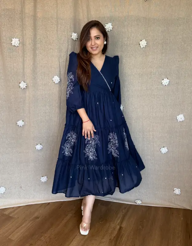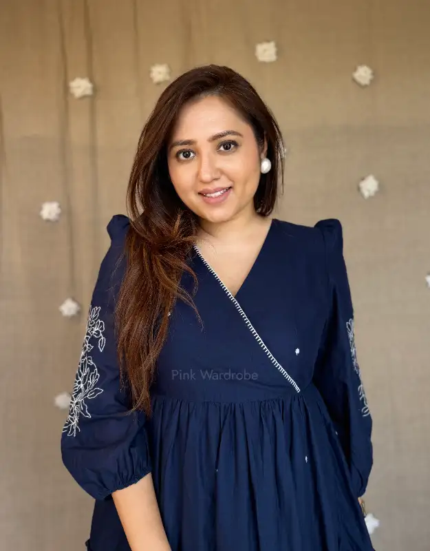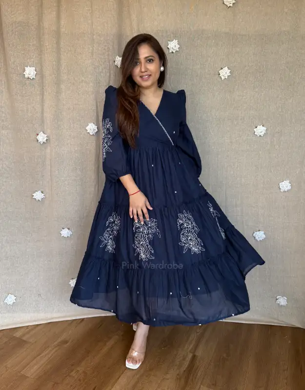 Luxurious premium cotton angrakha style v beckline in a beautiful bold black dress with delicate embroidery details all over is a perfect option for your date nights or holiday looks.