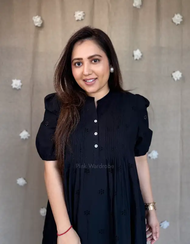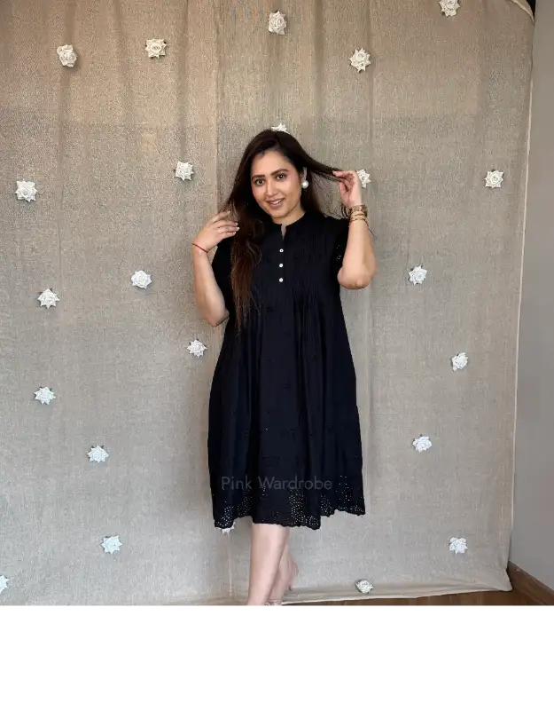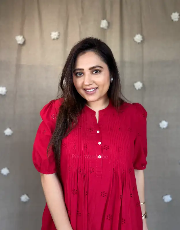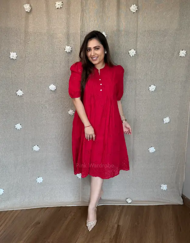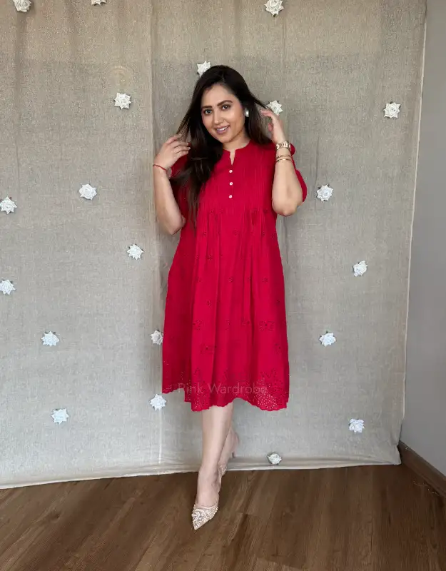 Elevate your wardrobe with our Chikankari Schiffli Work Dress in stunning two-tone red and black. A chic mid-length A-line silhouette with a high neck and pockets on both sides, this piece is perfect for luxury holiday wear, brunch dates, office-to-date-night looks, and effortless everyday elegance. Comfortable, modest, and crafted for women who prefer premium fashion.