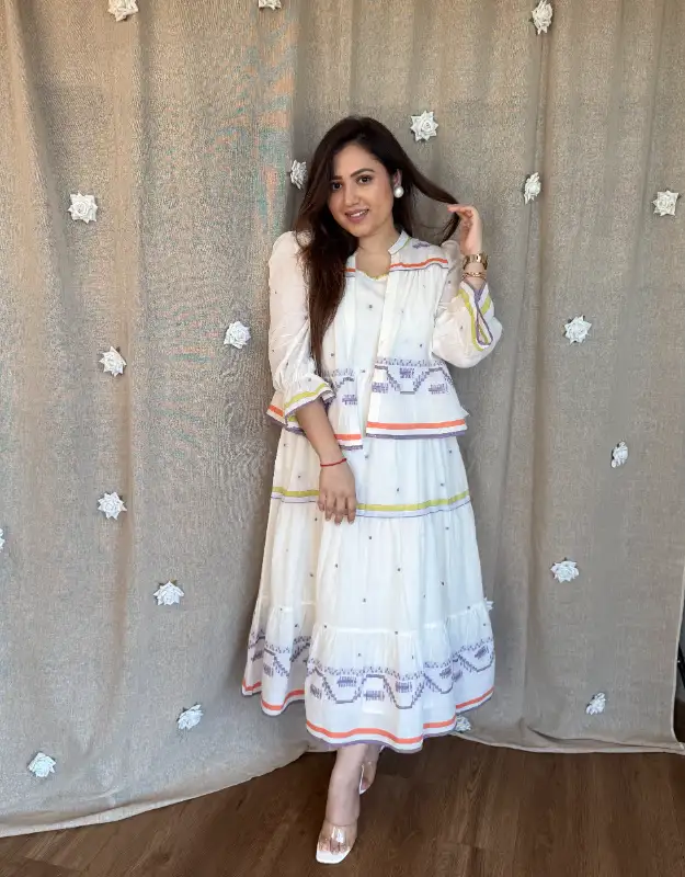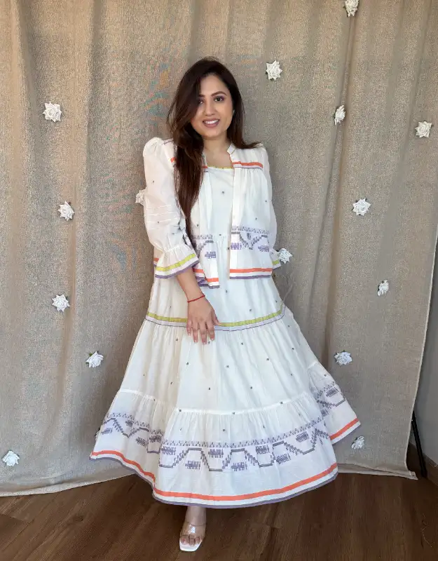 Ethereal and timeless, this moon-like cloud-white premium Jamdani dress is crafted for women who love understated luxury. Accented with delicate purple and soft light-orange woven motifs, the dress carries a soothing, handcrafted charm that feels effortlessly elegant. Paired with a short Jamdani jacket in the same fabric, this ensemble offers endless styling possibilities—wear it layered for a refined look or keep it minimal for relaxed elegance.
