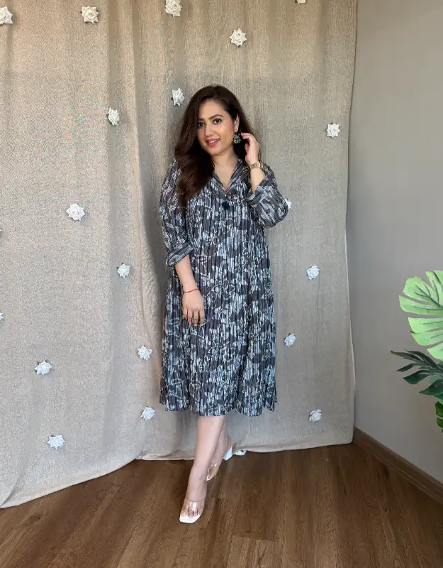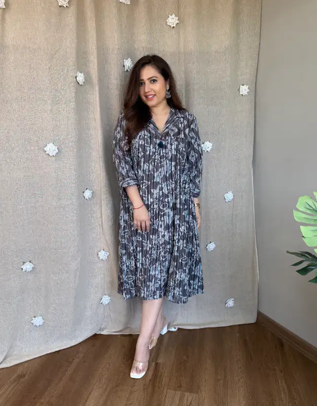 Elegant, structured, and effortlessly versatile, our Charcoal Bloom Collar Dress is tailored in premium soft cotton featuring sophisticated charcoal, grey, and blue floral abstract prints. Designed with a smart collared neckline and graceful A-line flare fit, this dress offers a polished silhouette that is both flattering and comfortable. The structured fall and modern tailoring make it perfect for office wear, meetings, smart casual outings, and elevated daily styling. A timeless wardrobe essential for women who love understated elegance with contemporary charm.