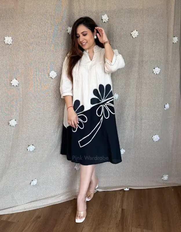 A timeless monochrome cotton dress designed for effortless elegance. Featuring a stunning mix of floral motifs and color-blocking details in a chic black-and-white palette, this mid-length modest fit dress blends comfort with statement style. Crafted in breathable premium cotton, it’s perfect for summer outfits, holiday wear, resort wear, travel looks, and everyday chic dressing. Light, airy, and easy to style, this dress is ideal for women looking for elegant cotton dresses, modest summer fashion, and premium casual wear with a modern edge.