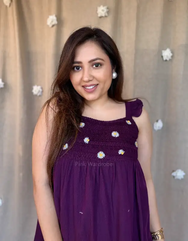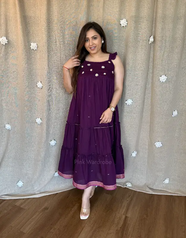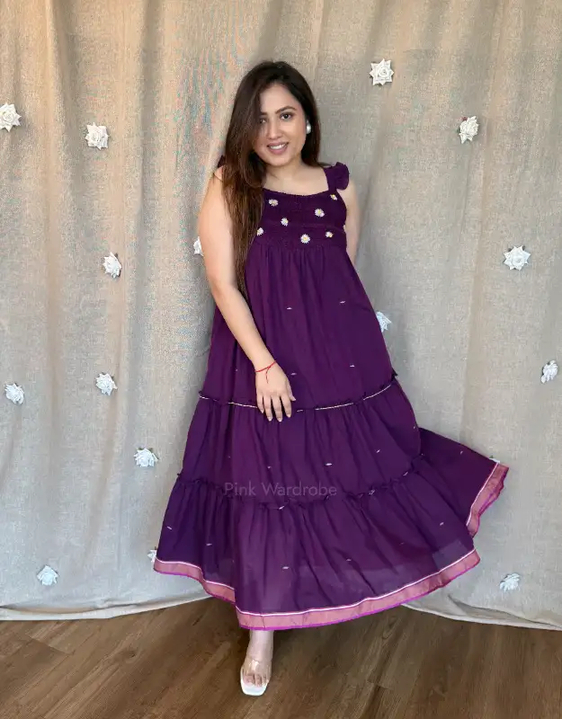 Step into the festive season with this purple woven dress in premium cotton, designed for effortless elegance and comfort. Crafted in breathable woven cotton, this sleeveless dress features intricate crochet floral detailing on the neckline, adding a refined handcrafted touch. The flattering silhouette, smart one-side pocket, and rich purple hue make it a versatile pick that suits all age groups and body types.