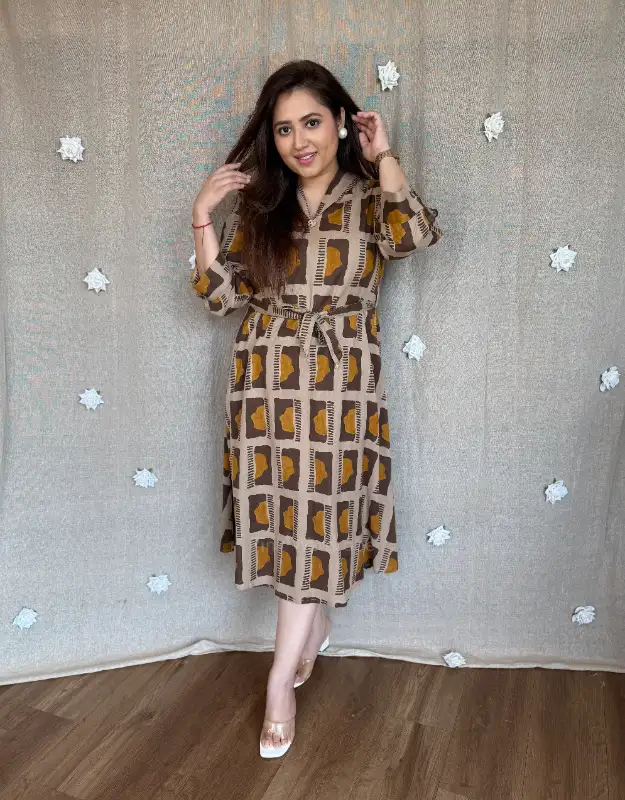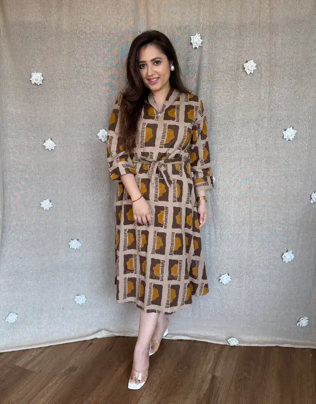 This rustic brown Ajrak dress in pure cotton is all about understated luxury — designed for women who love elegance with comfort.