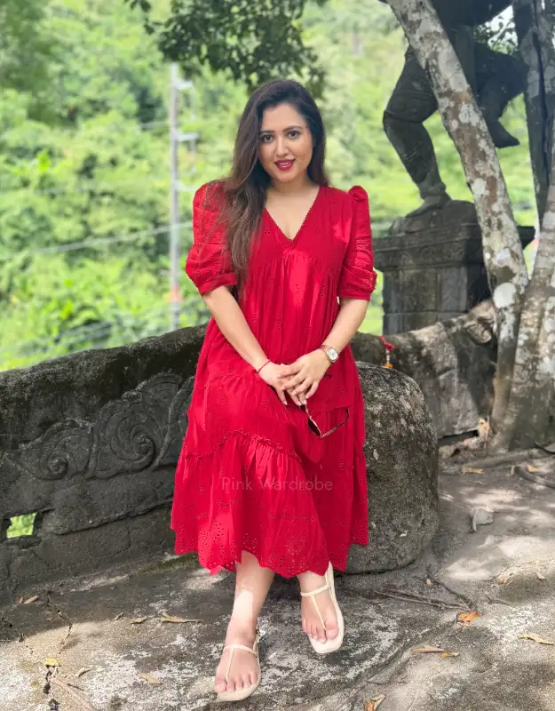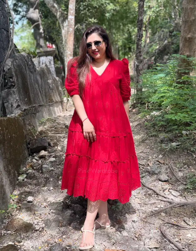 Crafted in premium cotton Schiffli, the Scarlet Élan Schiffli Dress blends effortless luxury with everyday elegance. Designed in a flattering Alia cut with an A-line silhouette, this beautiful red dress features a graceful V-neckline, intricate all-over Schiffli embroidery, and functional pockets on both sides. Comes with a soft attached liner for comfortable, seamless wear. Perfect for holidays, brunches, resort escapes, or elevated casual outings—this piece is ideal for women who appreciate premium fabrics, refined craftsmanship, and timeless style.
