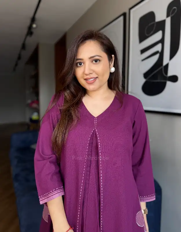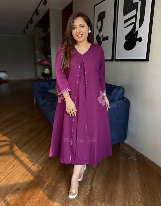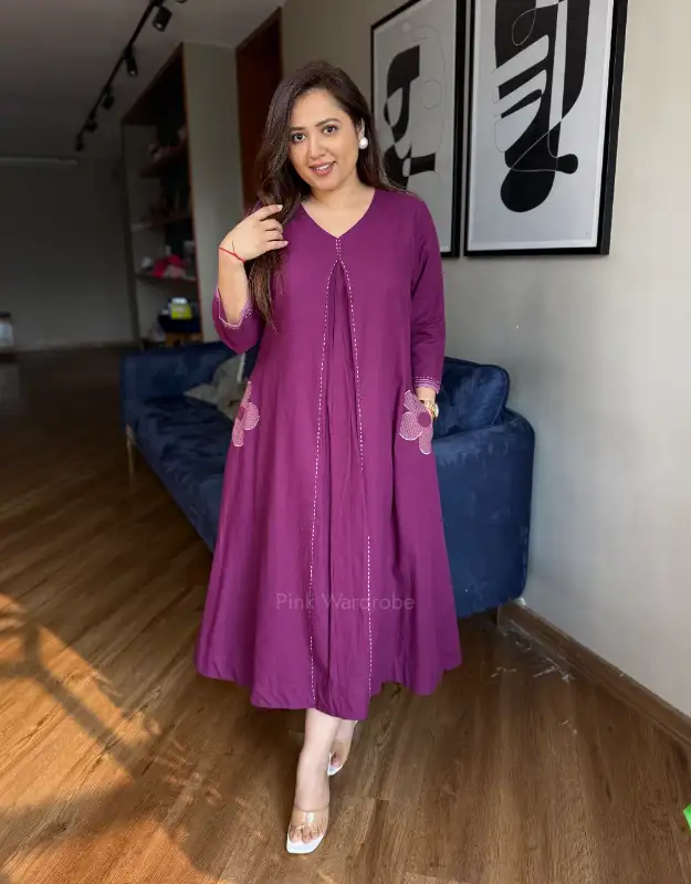 Meet your new smart-elegant everyday essential in a rich wine purple shade—an A-line kurta dress designed for comfort and compliments. Featuring functional side pockets on both sides with floral appliqué detailing, this piece gives you that polished workwear ethnic look while staying breathable and easy for all-day wear. Style it as a dress for holidays or pair it with pants/palazzos to wear it as a kurta—perfect for daily wear, office wear, and day-to-night dressing