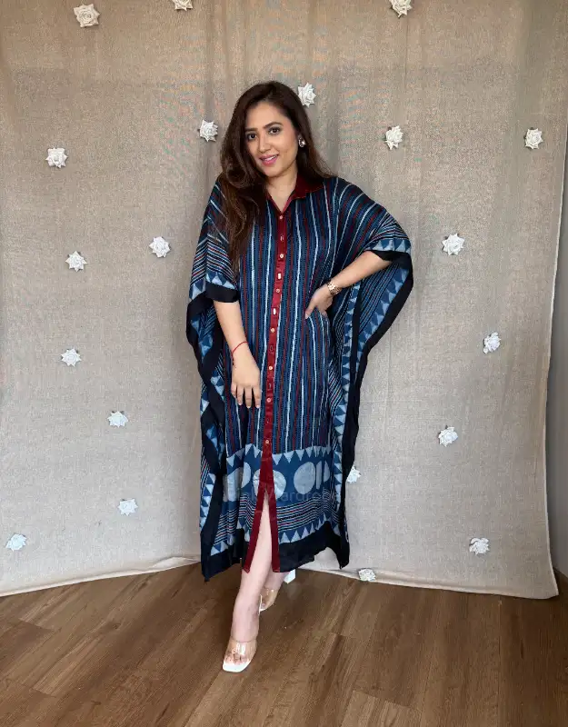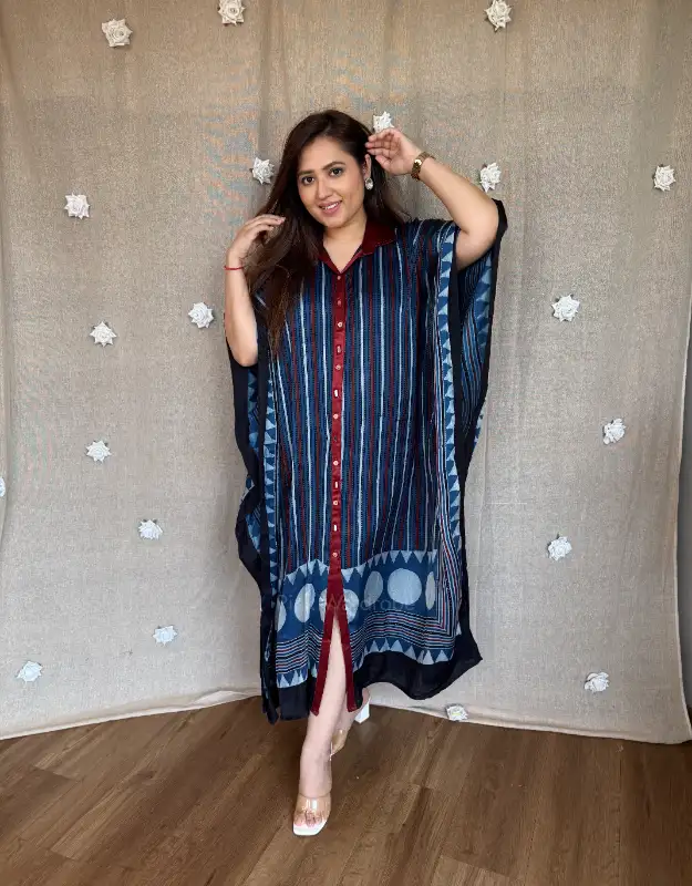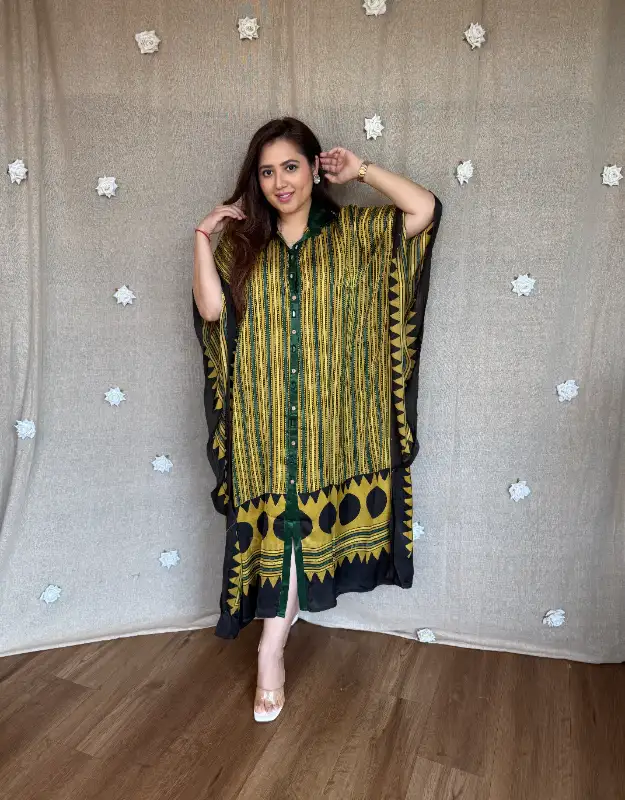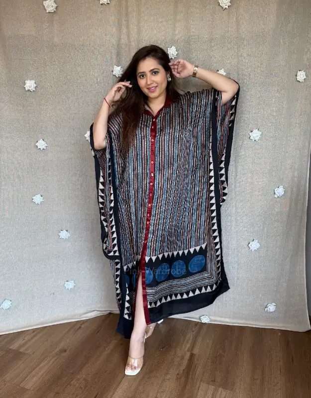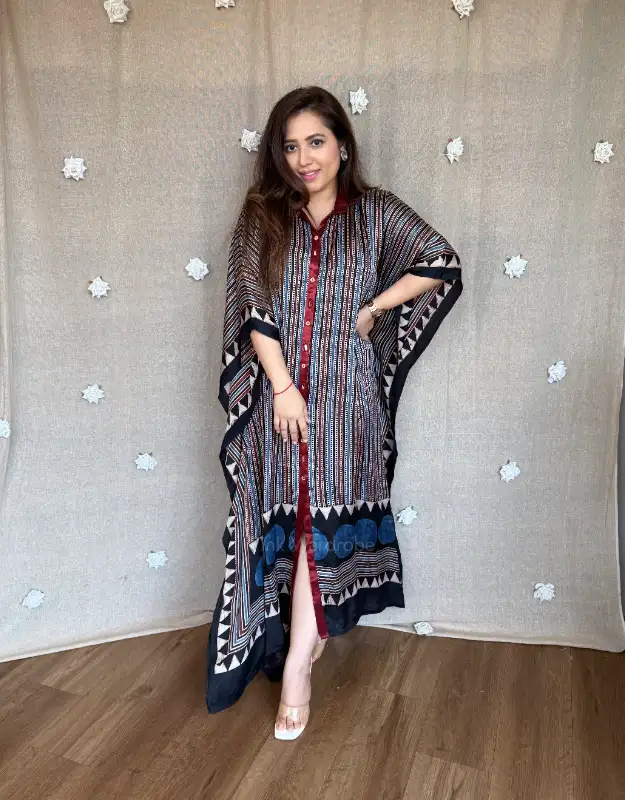Perfect for women searching for premium Ajrak kaftans, modal satin kaftan dresses, luxury Indian resort wear, handcrafted Ajrak prints, designer kaftans for holidays, Indo-western lounge wear, breathable summer kaftans, and contemporary ethnic wear.