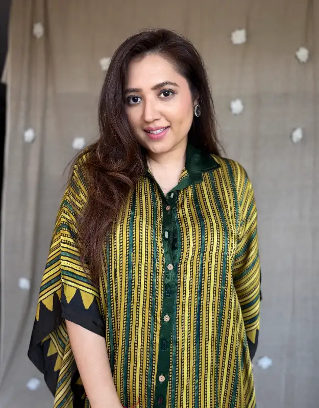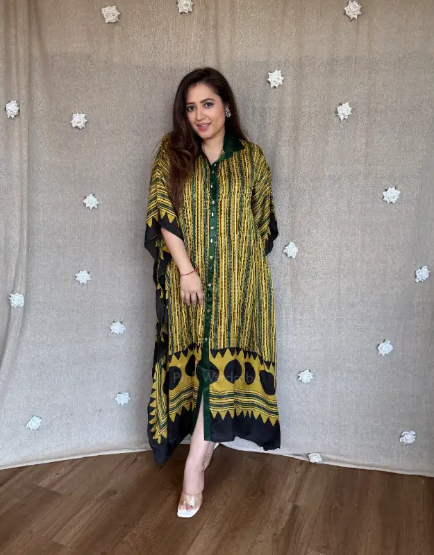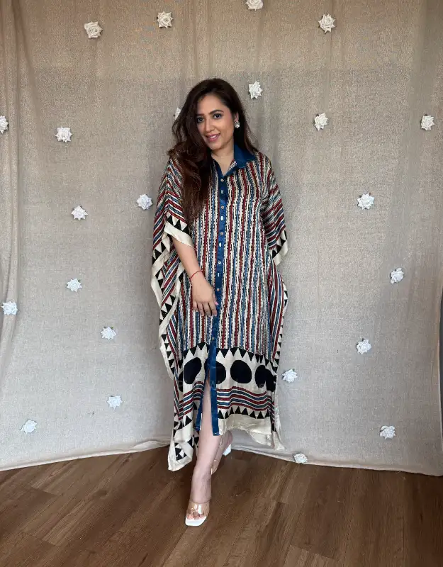 Designed for the modern woman who loves heritage textiles with a contemporary twist, this kaftan blends the richness of traditional Ajrak craftsmanship with the sheen and softness of modal satin. Lightweight, breathable, and ultra-comfortable, it’s your go-to outfit for vacations, brunches, intimate gatherings, and effortless festive looks.
