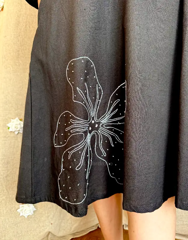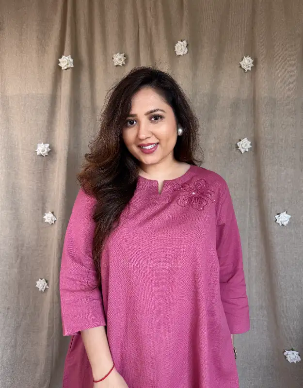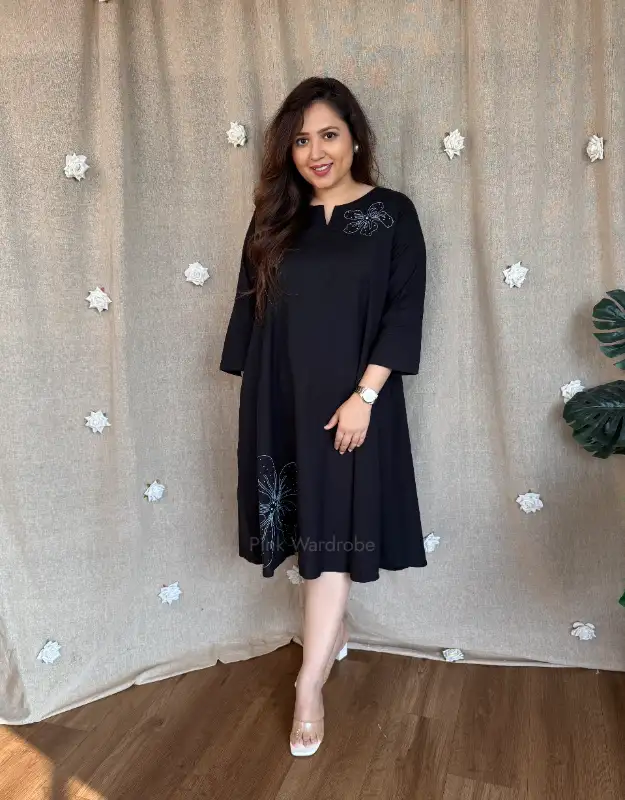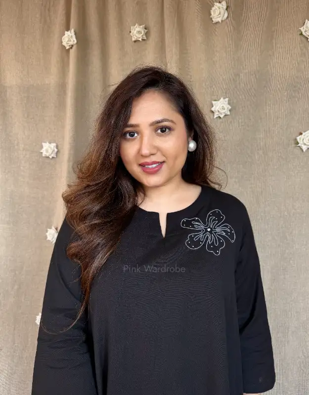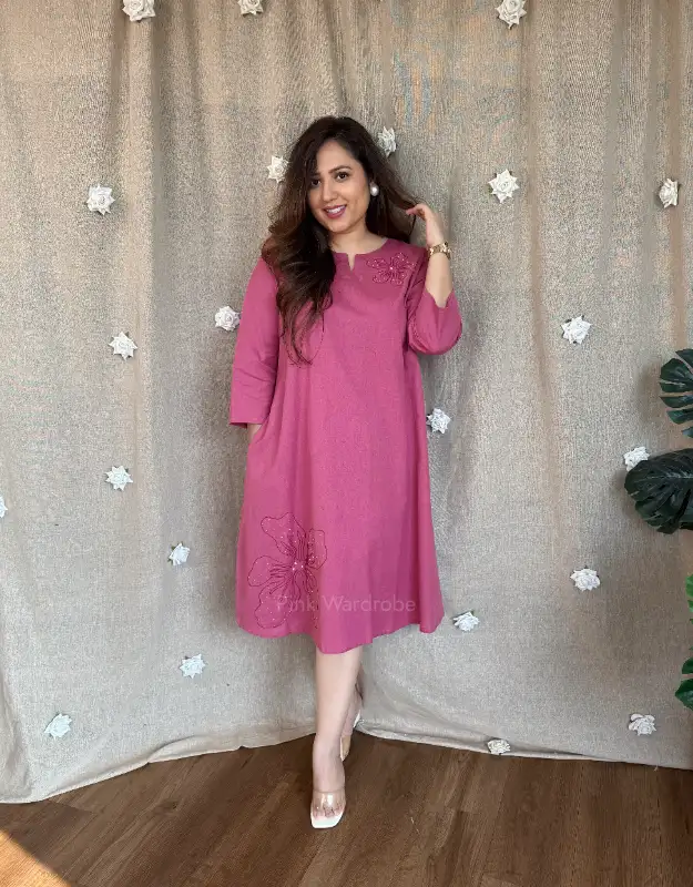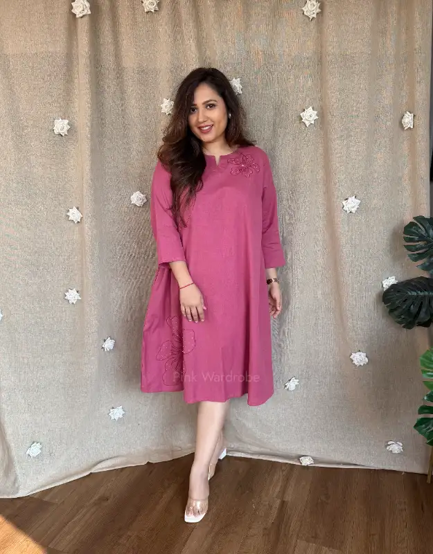 A beautifully crafted premium cotton A-line dress featuring subtle embroidery detailing on the shoulders and hemline, designed for effortless everyday elegance. Available in two timeless shades — onion pink and black — this versatile piece is perfect for daily wear, office wear, and smart casual styling.